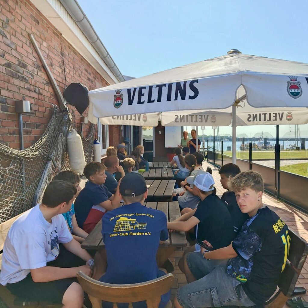 Nach dem Aufbauen der Zelte und dem ersten Kennenlernen beim Frühstück ging es direkt los. Gesegelt wurde im Hafen, wobei das Starten bei einer Regatta und das Thema Aufschießer im Mittelpunkt standen.